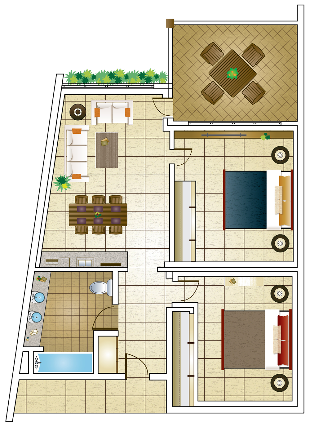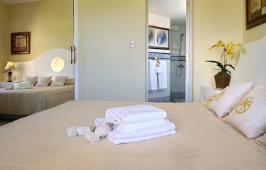 The suite features two bedrooms with flexible bedding configurations, one full bathroom, a spacious living room, and a fully equipped kitchen. Step out onto your private balcony or patio to enjoy stunning island views. Full air conditioning ensures a comfortable stay no matter the season.